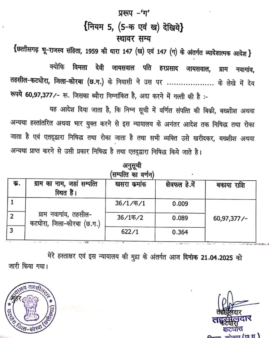 प्रकरण में न्यायालय ने विमला देवी जायसवाल, निवासी ग्राम नवागांव, तहसील कटघोरा, जिला कोरबा (छ.ग.) के नाम दर्ज संपत्तियों को कुर्क करने का आदेश पारित किया है। नीचे संबंधित भूमि का विवरण प्रस्तुत है: