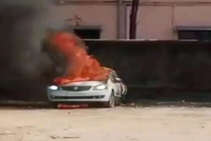 कोरबा में धूं-धूं कर जली खड़ी कार’ सिविल लाइन इलाके में मची अफरातफरी, कचरे की आग की चपेट में आई लग्जरी गाड़ी