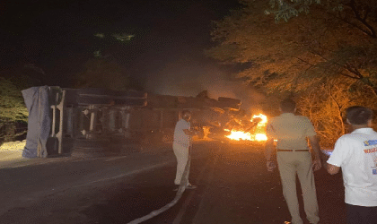 भयानक हादसा: दो ट्रकों की टक्कर के बाद वैन में लगी आग, चालक जिंदा जला