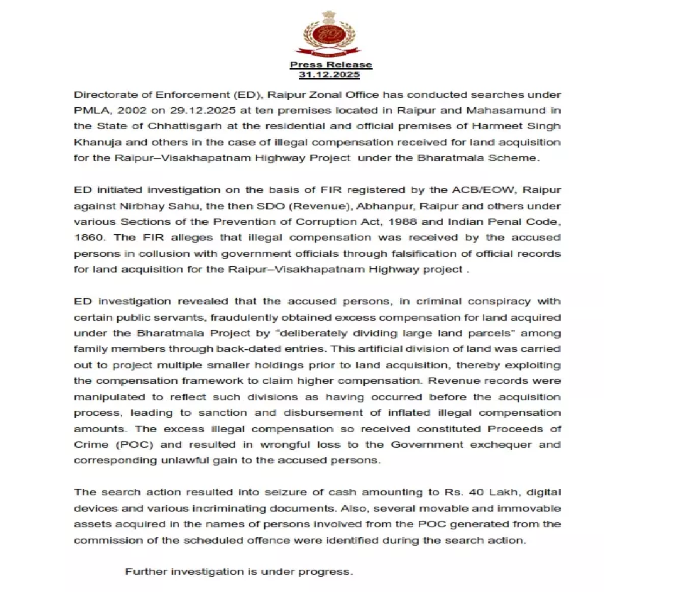 ED रायपुर ज़ोनल ऑफिस की ओर से जारी बयान में कहा गया है कि भारतमाला स्कीम के तहत रायपुर-विशाखापत्तनम हाईवे प्रोजेक्ट के लिए भूमि अधिग्रहण में भारी अनियमितताओं के सबूत मिले हैं। एजेंसी ने स्पष्ट किया कि जांच अभी जारी है और आने वाले दिनों में और भी खुलासे हो सकते हैं।