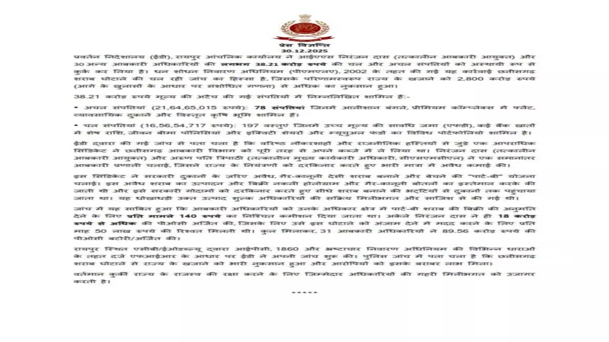 रायपुर। छत्तीसगढ़ के चर्चित शराब घोटाले में प्रवर्तन निदेशालय (ईडी) ने बड़ी कार्रवाई करते हुए तत्कालीन आबकारी आयुक्त आईएएस निरंजन दास सहित 30 आबकारी अधिकारियों की कुल 38.21 करोड़ रुपये की संपत्ति अस्थायी रूप से कुर्क कर ली है। यह कार्रवाई ईडी के रायपुर आंचलिक कार्यालय द्वारा धन शोधन निवारण अधिनियम (PMLA), 2002 के तहत की गई है।