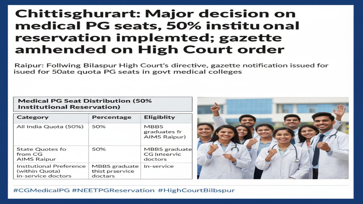 रायपुर: छत्तीसगढ़ के चिकित्सा शिक्षा क्षेत्र में आज एक बड़ा बदलाव देखने को मिला है। छत्तीसगढ़ सरकार ने बिलासपुर हाई कोर्ट के निर्देशानुसार शासकीय मेडिकल कॉलेजों की राज्य कोटे की 50% पीजी (Post Graduate) सीटों के संबंध में राजपत्र (Gazette) संशोधन प्रकाशित कर दिया है। इस फैसले से राज्य के मेडिकल छात्रों, विशेषकर छत्तीसगढ़ से एमबीबीएस करने वालों और सुदूर क्षेत्रों में कार्यरत डॉक्टरों को बड़ी राहत मिली है।