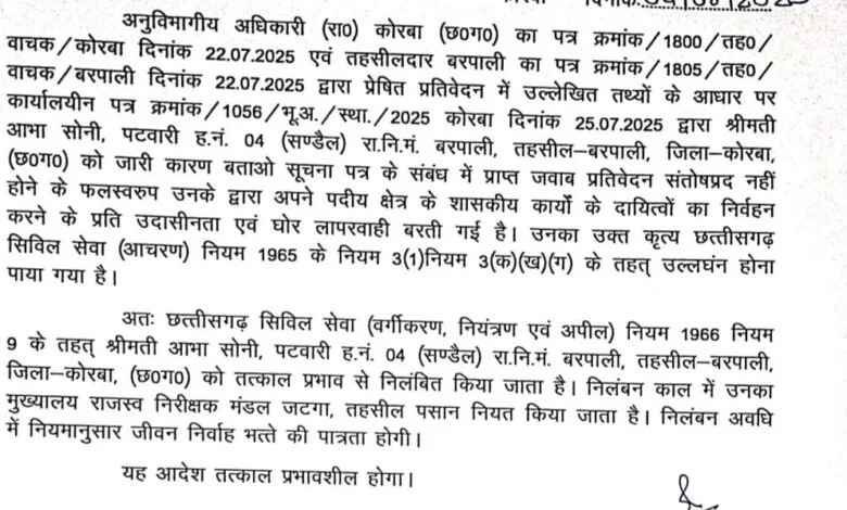 कोरबा, 5 अगस्त 2025।तहसील बरपाली अंतर्गत कार्यरत पटवारी आमा सोनी को शासकीय दायित्वों के निर्वहन में उदासीनता एवं घोर लापरवाही बरतने के आरोप में तत्काल प्रभाव से निलंबित कर दिया गया है। यह कार्रवाई कोरबा के अनुविभागीय अधिकारी (रा.) द्वारा की गई है।
