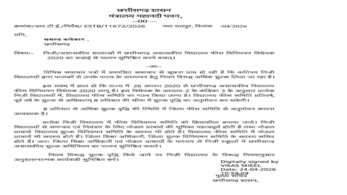 News The Power City > Blog > छत्तीसगढ़ > CG BREAKING : छत्तीसगढ में निजी स्कूलों पर सख्ती, फीस विनियमन कानून के पालन के लिए कलेक्टरों को निर्देश