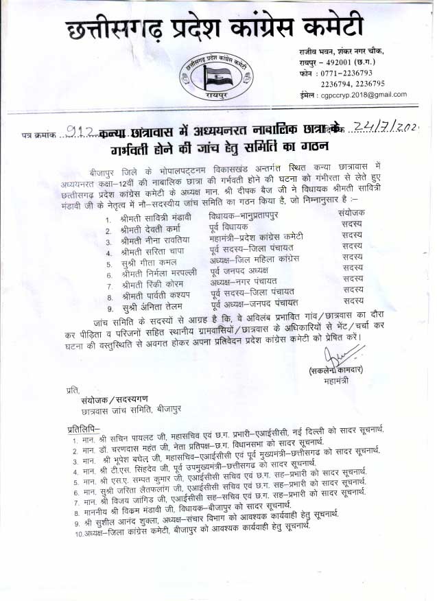 रायपुर: छत्तीसगढ़ के बीजापुर जिले के भोपालपटनम विकासखंड स्थित कन्या आश्रम छात्रावास में पढ़ने वाली 12वीं कक्षा की एक नाबालिग छात्रा के गर्भवती होने का मामला सामने आने के बाद पूरे प्रदेश में हड़कंप मच गया है। प्रदेश कांग्रेस अध्यक्ष दीपक बैज ने घटना की गंभीरता को देखते हुए छत्तीसगढ़ प्रदेश कांग्रेस कमेटी के 9 सदस्यीय जांच समिति का गठन किया है। विधायक सावित्री मंडावी के नेतृत्व में गठित यह टीम जल्द ही घटनास्थल का दौरा कर अपनी रिपोर्ट कांग्रेस नेतृत्व को सौंपेगी।