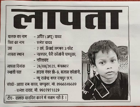 जानकारी के अनुसार 7 वर्षीय अर्पित यादव रायपुर से तीज के त्योहार पर अपने नाना के घर पांडुका पहुंचा था। 26 अगस्त की शाम अर्पित खेलते-खेलते घर के गेट से बाहर निकल गया। उसके बाद से उसका कुछ पता नहीं चला है। घर वालों ने काफी खोजबीन की और जब नहीं मिला तो पांडुका थाने में रात 8 बजे बच्चे के नाना ने गुमशुदगी की रिपोर्ट दर्ज कराई है।