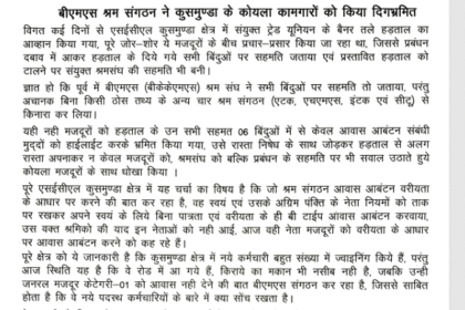 बीएमएस श्रम संगठन ने कुसमुण्डा के कोयला कामगारों को किया दिगभ्रमित