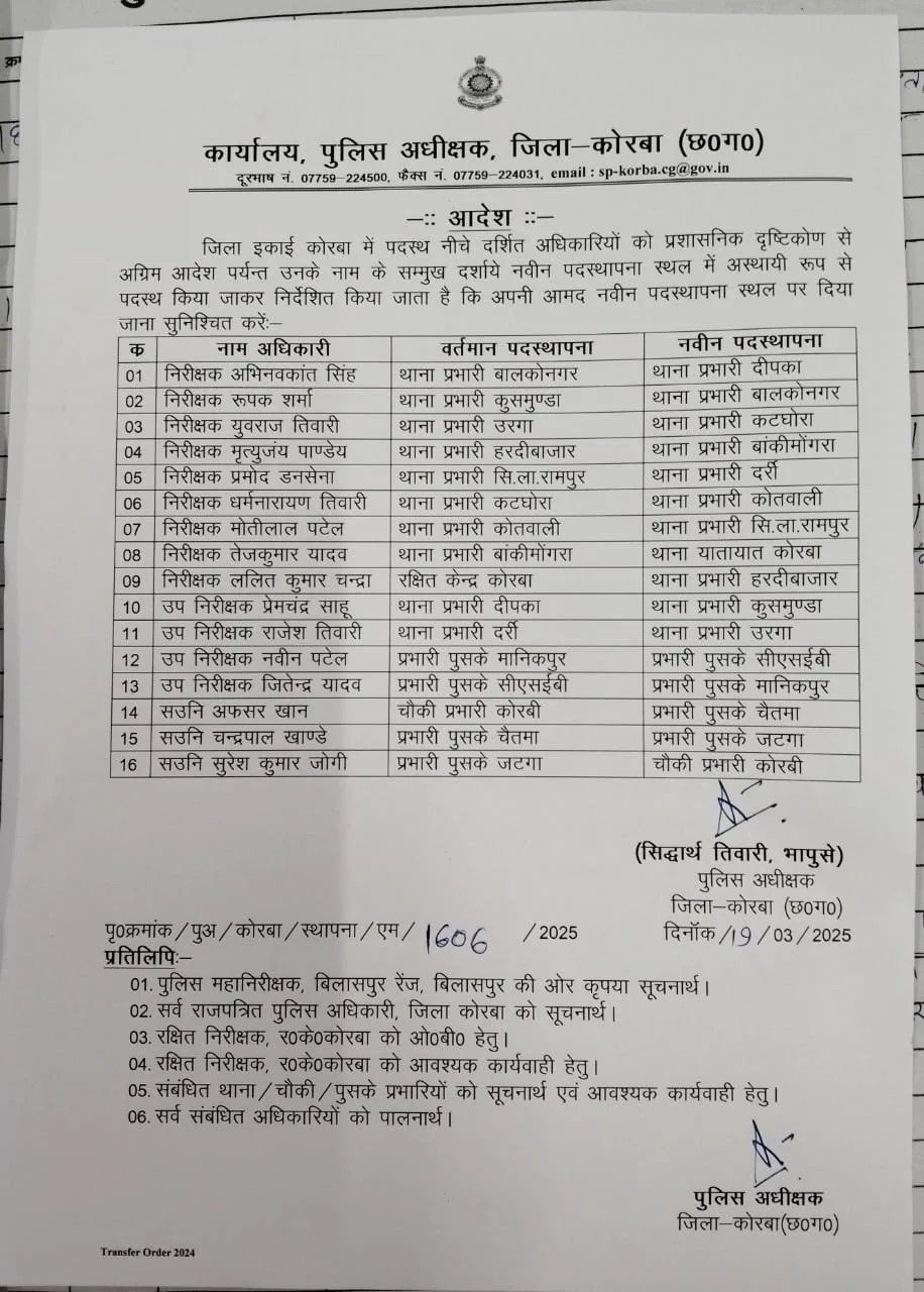 कोरबा: कोरबा जिले में पुलिस प्रशासन में बड़े स्तर पर फेरबदल किया गया है। जिला पुलिस विभाग ने लगभग सभी थानों के प्रभारियों को बदलने का फैसला लिया है। यह तबादला आदेश कानून व्यवस्था को और अधिक सुदृढ़ करने और पुलिसिंग को प्रभावी बनाने के उद्देश्य से किया गया है।