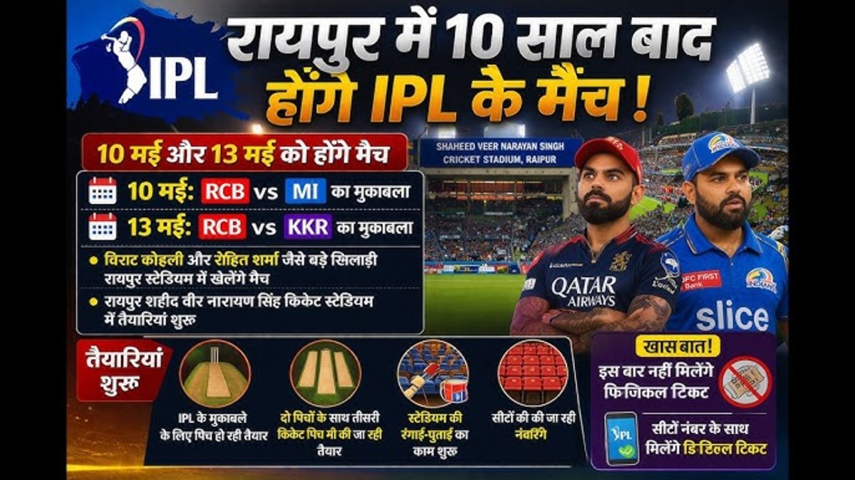 IPL 2026 : 10 और 13 मई को रायपुर में IPL का जलवा’ रोहित शर्मा-विराट कोहली’ के फैंस में जबरदस्त उत्साह