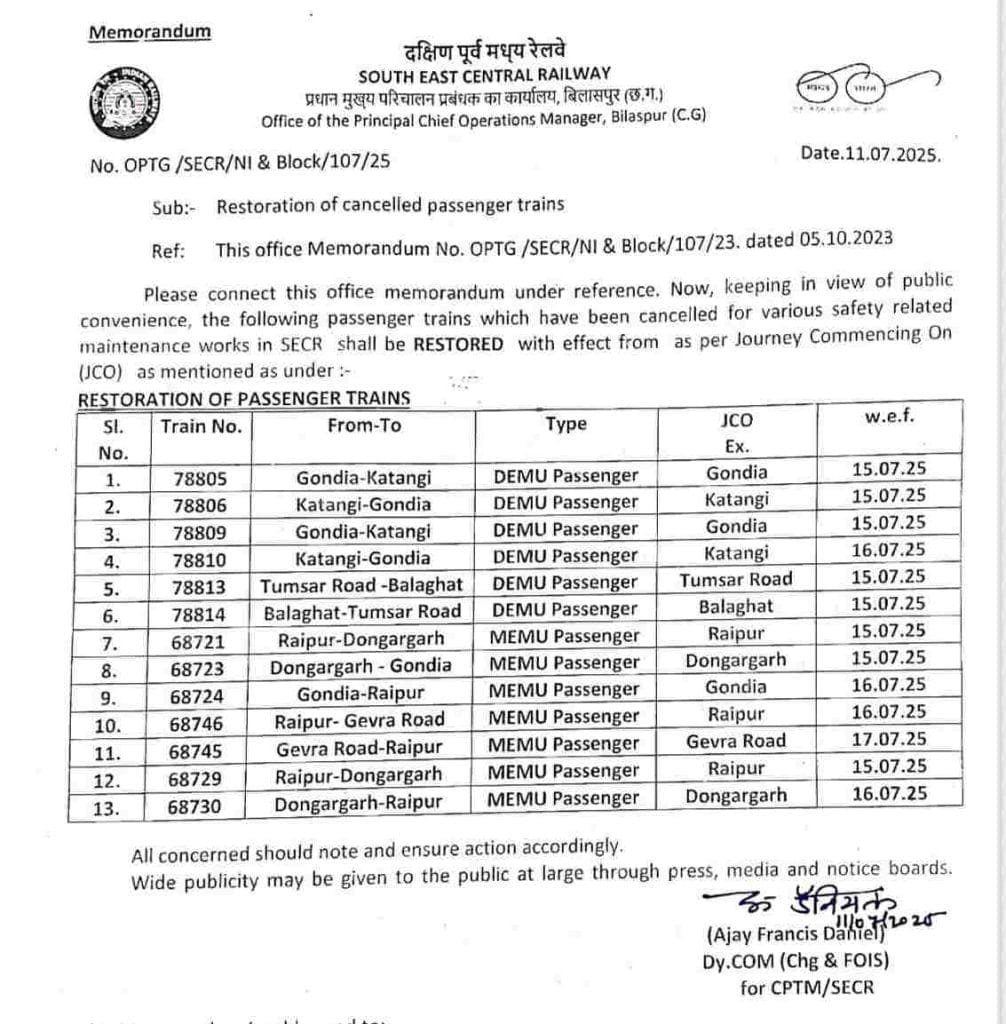 रेलवे प्रशासन ने बताया कि 15 जुलाई से गोंदिया-कटंगी, रायपुर-डोंगरगढ़, रायपुर-गेवरा रोड, तूमसर रोड-बालाघाट समेत 13 लोकल मेमू और डेमू पैसेंजर ट्रेनें फिर से पटरियों पर लौटेंगी. 17 जुलाई तक सभी रूटों पर संचालन पूरी तरह बहाल कर दिया जाएगा. इन ट्रेनों के संचालन से कम किराये में यात्रा का विकल्प फिर से खुलेगा और यात्रियों को निजी वाहनों या बसों पर निर्भरता कम करनी पड़ेगी. साथ ही विद्यार्थियों और नौकरीपेशा लोगों की आवाजाही भी सुगम हो सकेगी।