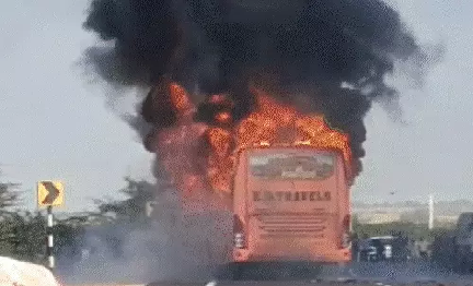 जैसलमेर।’ राजस्थान के जैसलमेर में जैसलमेर-जोधपुर हाईवे मंगलवार दोपहर 3.30 बजे चलती एसी स्लीपर बस में आग लग गई। देखते ही देखते आग ने भीषण रूप ले लिया। बचने के लिए लोग चलती बस से कूद गए।