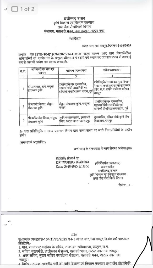 इसी क्रम में कपिल देव दीपक, संयुक्त संचालक कृषि को इंदिरा गांधी कृषि विश्वविद्यालय, रायपुर में कुलसचिव की जिम्मेदारी सौंपी गई है। यह बदलाव विश्वविद्यालयों की कार्यप्रणाली को अधिक प्रभावी और सुचारु बनाने के उद्देश्य से किया गया है।