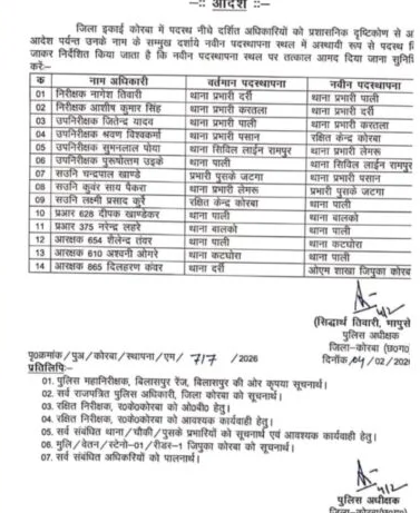 कोरबा में थाना प्रभारियों का फेरबदल