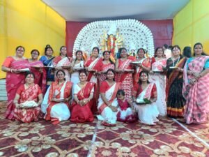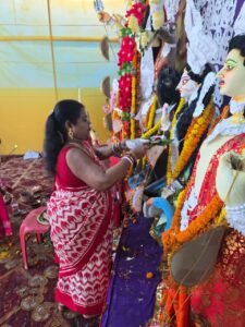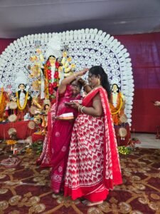 कोरबा/कुसमुंडा – नेहरु नगर पानी टंकी मैदान में अपराजिता दुर्गा पूजा समिति के द्वारा विजयदशमी के अवसर पर देवी दुर्गा के विसर्जन के पूर्व देवी बरन सिंदूर खेला की प्रथा को शादीशुदा महिलाओं के द्वारा जारी रखा गया।इस अवसर पर बंगाली समाज की महिलाएं देवी का मुंह मीठा करते हुए एक दूसरे को मिठाई बाटे और सिंदूर लगाए।अपने खुशी का इजहार करते हुए देवी भजन में महिलाए थिरकते हुए नजर आए।
