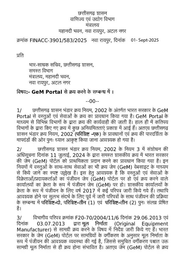 रायपुर। छत्तीसगढ़ सरकार ने शासकीय खरीदी प्रक्रिया में पारदर्शिता और अनुशासन सुनिश्चित करने के लिए बड़ा कदम उठाया है। राज्य सरकार ने सभी विभागों को आदेश जारी किया है कि अब सभी वस्तुओं और सेवाओं की खरीदी जेम (GeM) पोर्टल के माध्यम से ही की जाए।